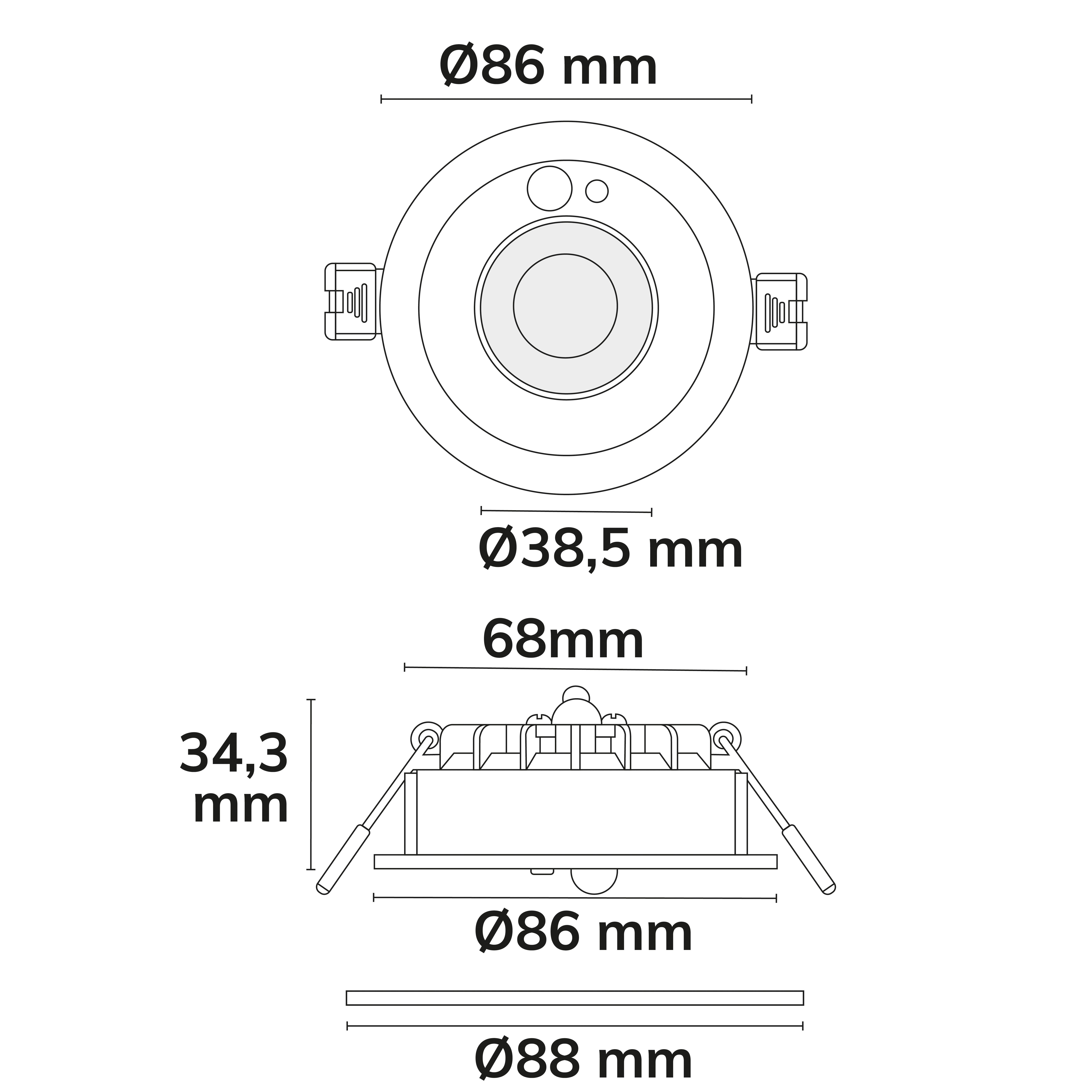- Abmessungen Leuchte: Außendurchmesser: 88mm Einbautiefe: 35mm